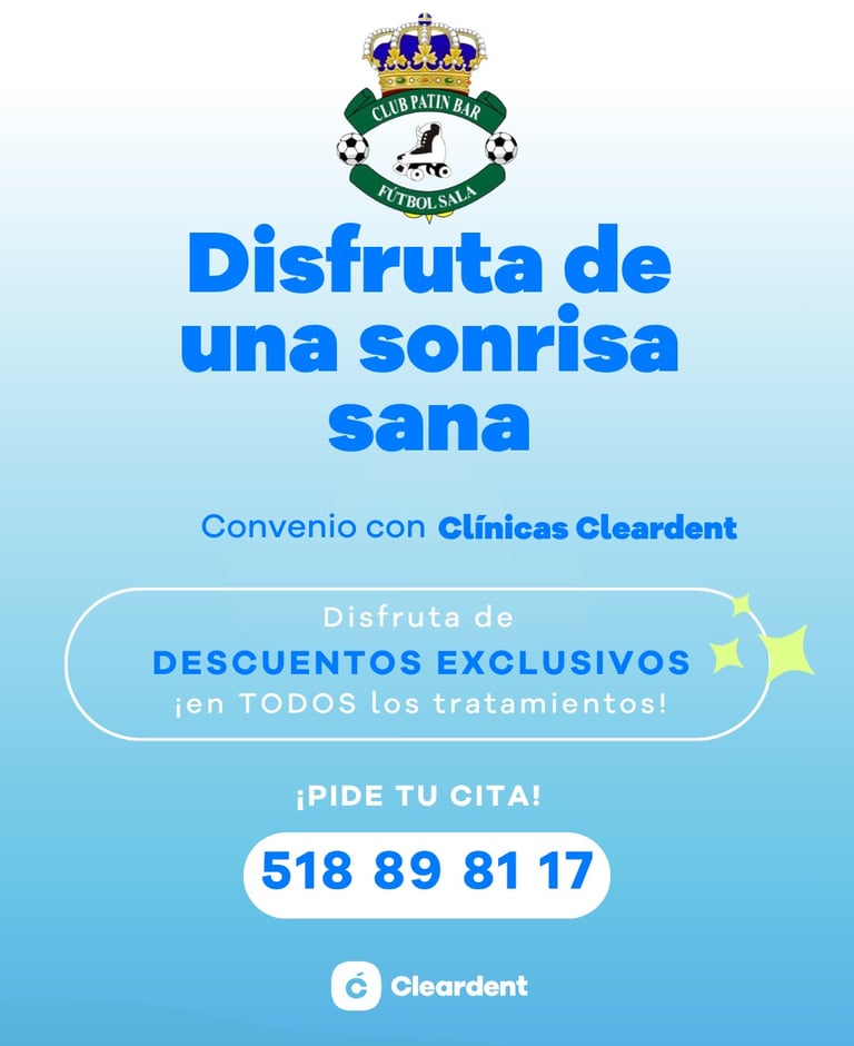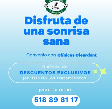 Nos complace anunciar un nuevo acuerdo entre nuestro Club y Clínicas Dentales Cleardent. Este convenio permitirá a nuestros miembros y jugadores beneficiarse de descuentos exclusivos en una amplia variedad de tratamientos dentales. A través de esta colaboración, buscamos no solo cuidar el desempeño en el campo, sino también la salud dental de nuestra comunidad.